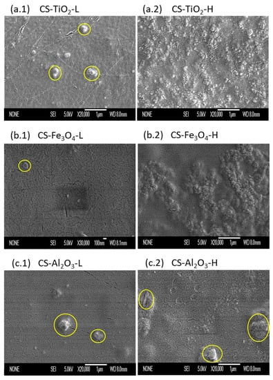 SEM images of the top surfaces of the prepared CS membranes with NPs. CS-NP-L for low NP concentrations (TiO2 (a.1); Fe3O4 (b.1); and Al2O3 (c.1)) and CS-NP-H for high NP concentrations (TiO2 (a.2); Fe3O4 (b.2); and Al2O3 (c.2)). Yellow circles indicate NPs aggregates. SEM surface images were taken at ×20,000 magnification unless the CS-Fe3O4-L image at ×30,000 magnification.