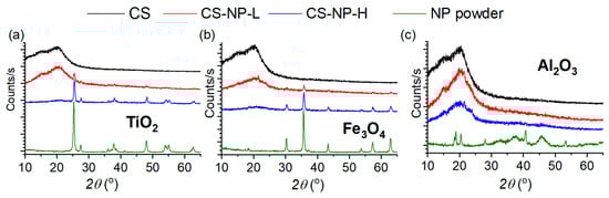 X-ray diffractograms of the CS membrane prepared without NP (black); the CS-NP membranes prepared with NPs (a) TiO2, (b) Fe3O4, and (c) Al2O3 with low concentration (red) and high concentration (blue); and NPs (NP powder, green spectra).