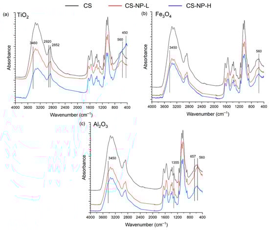 For CS-TiO2 membranes (Figure 4a), a strong band at 450 cm−1 was observed due to Ti–O vibration, and at 560 cm−1, assigned to the Ti–O–Ti bond [11,48,49], confirming the existence of TiO2 compound. A slight increase in bands at 2920 and 2852 cm−1 is a characteristic of TiO2–OH groups and at 3460 cm−1 for O–H peak from TiO2 [4]. For CS-Fe3O4 membranes, a peak at 560 cm−1 attributed to the Fe–O bond and a slight increase in the band at 3460 cm−1 for the O–H peak from Fe3O4 (Figure 4b) proved the existence of Fe3O4 [24,50]. The formation of the CS-Al2O3 composite was confirmed by the presence of characteristic bands at 560 and 657 cm−1 due to the Al–O vibration and at 1355 cm−1 corresponding to the Al=O bond (Figure 4c) [42,51,52,53].