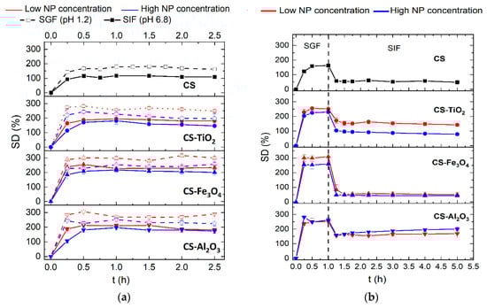 The SD of the CS membrane prepared without NPs was 35% lower in the SIF medium compared to that in the SGF medium (Figure 5a). The CS-NP composite membranes followed the same trend as that of the CS membrane, although the difference in SD values in SGF and SIF solutions was lower, around 16–30%, than that of the CS membrane being the SD greater for the CS-NP membranes prepared with low NPs concentrations.