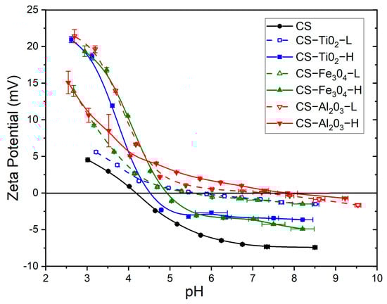 As can be seen in Figure 6, the zeta potential trend of the CS-TiO2-L and CS-Fe3O4-L membranes became flatter, with the pH enhancing their positive surface charge. Therefore, in the SIF solution (pH = 6.8), the CS-TiO2-L and CS-Fe3O4-L membranes are practically electroneutral. Similarly, the CS-Al2O3 membranes are almost electroneutral at pH 6.8, independent of the Al2O3 concentration in the CS solution.