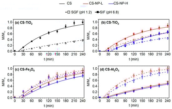 Figure 5a shows the change in the swelling degree (SD) with the time of the CS membrane and the CS-NP composite membranes in SGF and SIF solutions. All CS-based membranes reached their maximum swelling degree within the first 15–30 min of the experiment regardless of the pH of the solution. No significant variations in weight loss were detected in the samples during the 2.5 h of the experiment, indicating the non-degradation of the membranes in SGF and SIF solutions.