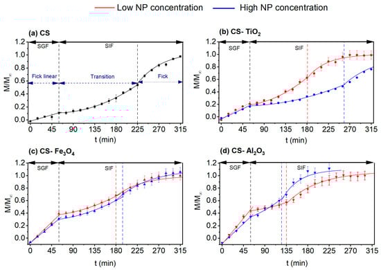 ASA transport through the CS membranes prepared without NPs ((a), ■) and with NPs, TiO2 ((b), ●), Fe3O4 ((c), ▲), and Al2O3 ((d), ▼) for low (red) and high (blue) NP concentrations in SGF (◯, △, ▽, and dash line) and SIF (●, ▲, ▼⤓, and solid line).