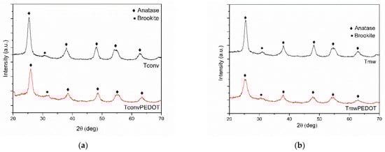 X-ray diffraction patterns for prepared TiO2 samples: (a) Tconv and TconvPEDOT; (b) Tmw and TmwPEDOT.