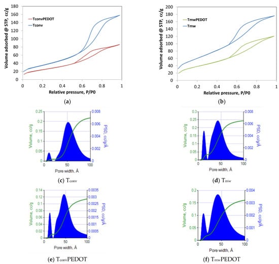 Textural characterization of TiO2/PEDOT composites: N2 adsorption/desorption isotherms for Tconv and TconvPEDOT (a) and for Tmw and TmwPEDOT (b); DFT pore size distributions for Tconv (c), Tmw (d), TconvPEDOT (e), and TmwPEDOT (f) prepared samples.