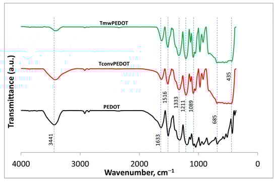 Fourier Transform Infrared Spectroscopy was employed to study the surface chemistry of the synthesized systems. FTIR spectra of all TiO2/PEDOT nanocomposites indicate characteristic bands for both PEDOT and TiO2 components. As observed in Figure 4, the characteristic band for the C–S stretching, centered at 685 cm−1 for the PEDOT sample [27], slightly shifts towards higher wavenumbers, 688.5 cm−1, for both prepared composites. The bands around 1211 and 1089 cm−1 correspond to the asymmetrical and symmetrical stretching of the C–O–C bonds that are characteristic of the ethylene-dioxy group, while the bands at 1514 and 1333 cm−1 are due to the C = C and C–C bonds that extend into the thiophene ring [27,28]. A higher shift of 6 cm−1 is noticed for the C = C stretching in the case of the TiO2/PEDOT. Furthermore, an additional band around 435 cm −1, characteristic of titanium oxide bonds (Ti–O–Ti), is registered for the 2 samples containing metal oxide. The band centered at 1633 cm−1 and the broad band centered at 3441 cm−1 for the PEDOT sample confirm the presence of the hydroxyl groups on its surface (bending vibrations and stretching vibrations, respectively) [29,30]. For the nanocomposites, these bands are slightly shifted towards smaller wavenumber values.