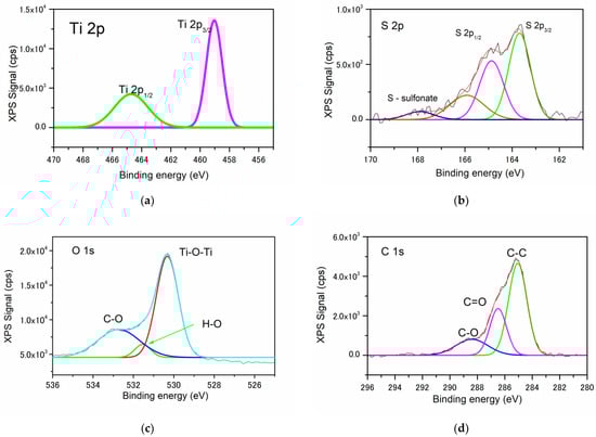 Further, the high-resolution deconvoluted spectra of Ti2p, S2p, O1s, and C1s of the TconvPEDOT sample are shown in Figure 5a–d. All XPS peaks were deconvoluted using the Gaussian method. Thus, the Ti2p peak was deconvoluted into two main peaks positioned at 459.03 eV (Ti2p3/2) and 464.71 eV (Ti2p1/2), which correspond to Ti4+, characteristic of the TiO2 framework [31,32]. Further, the S2p peak was found to consist of 4 deconvoluted peaks, 2 of which are centered at 164.87 and 163.69 eV and assigned to spin-split doublets of S2p1/2 and S2p3/2, respectively [33]. Since a Ti–S bond was also reported in the range of 163–164 eV, a higher peak intensity is registered for S2p3/2 compared to that of S2p1/2. This may lead to the conclusion that a bond was formed between TiO2 and PEDOT polymer during the synthesis process [24]. The low-intensity peak centered at 168 eV could be associated with sulfonates [34], formed during the oxidative polymerization of PEDOT. The O1s deconvoluted spectra (Figure 5c) show 2 main peaks centered at 530.3 eV and 532.7 eV, which can be ascribed to Ti-O-Ti bonds in TiO2 [35] and C-O bonds in the thiophene ring of PEDOT. The small peak at 531.5 eV was reported by Matouk et al. [36] and Ghafourisaleh et al. [37] as hydroxide contamination, whereas Schultheiss et al. [34] attributed it to oxygen atoms from the sulfonate group, this being in good agreement with the results of the S2p analysis. The C1s spectra (Figure 5d) exhibit three peaks, which can be assigned to C–C/C–H, C–O-C, and C=O bonds of PEDOT [34]. These results constitute good evidence that a TiO2/PEDOT system was obtained.