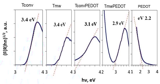 As the photocatalytic characteristic of a photocatalyst depends on light absorption, the band gap energy has to be determined. Thus, UV-DR spectra were registered and data were exploited to find out information on the optical band gap. Therefore, Figure 6 shows the Tauc plots obtained from diffuse reflectance spectra with Kubelka–Munk function for TiO2 and TiO2-PEDOT coated photocatalysts annealed by conventional (Tconv and TconvPEDOT) and microwave-assisted (Tmw and TmwPEDOT) heating methods. Band gap energy values thus determined are presented in Table 1. By analyzing the obtained values for the band gap energy, Tconv and Tmw photocatalysts were found to exhibit band gaps of 3.4 eV, which is favorable to the UV photocatalytic process, this being comparable with other studies presented in the literature reporting a value of 3.2 eV for commercial titanium oxide [1]. Moreover, as expected for PEDOT-containing samples, lower band gap values of 3.1 eV for the TconvPEDOT sample and 2.9 eV for the TmwPEDOT sample were found, confirming the hypothesis that composite photocatalysts incorporating PEDOT would exhibit enhanced response to visible light in comparison to bare TiO2. This is the result of heterojunction between two semiconductors, TiO2 and PEDOT, whose electronic band structures match well, thus enhancing the separation of photogenerated charge carriers. Similar results were obtained by Rahman (2020) when PANI (polyaniline), another conducting polymer, was used to sensitize TiO2 photocatalyst [38]. Therefore, the synthesized TiO2/PEDOT systems could be successfully used as photocatalysts for the decomposition of many harmful organic compounds under UV- and visible-light irradiation.
