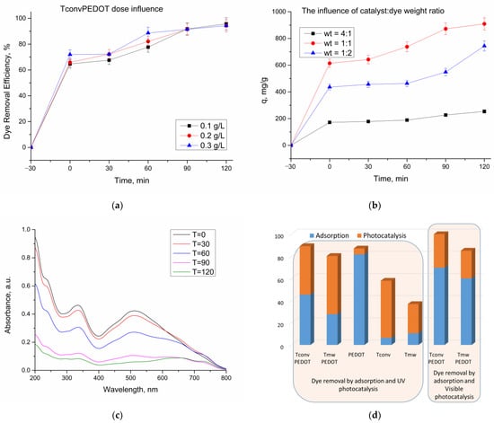 Photocatalytic degradation of Congo Red dye under various conditions: (a) effect of catalyst dose under UV exposure (catalyst: TconvPEDOT, 100 mg/L CR solution, 50 mL); (b) effect of catalyst:dye weight ratio under UV exposure (for 4:1 wt—0.01 g TconvPEDOT, 50 mg/L CR solution, 50 mL; for 1:1 wt—0.005 g TconvPEDOT, 100 mg/L CR solution, 50 mL; for 1:2 wt—0.005 g TconvPEDOT, 100 mg/L CR solution, 100 mL); (c) UV–Vis analysis of photocatalytic degradation of Congo Red dye (CR initial concentration = 100 mg/L, TconvPEDOT catalyst loading = 0.1 g); (d) dye removal through adsorption and photodegradation under UV and visible light.