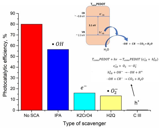 Aiming to elucidate the mechanism of degradation of CR dye by TiO2/PEDOT prepared systems, different scavengers such as IPA, 10 mmol L−1 (scavenger for •OH radical); potassium chromate, 25 mmol L−1 (scavenger for e−) [41]; H2Q, 0.25 mmol L−1 (scavenger for •O2−) [42]; and CIII, 10 mmol L−1 (for h+ traping) [43] were used. This allowed us to investigate the role of active species involved in the photocatalytic degradation of CR dye over the synthesized TiO2/PEDOT system. Hence, radical trapping control tests of the TconvPEDOT sample to study the oxidation of CR under UV light were carried out. Likely, most of the photocatalytic processes are usually conducted by free •OH radicals. Thus, to test the formation of •OH radicals in the photocatalytic mixture, isopropyl alcohol was used. Thus, as seen in Figure 8, the photo-oxidation rate of CR remained at 56.5% when IPA was used as •OH radicals scavenger, being lower than that of a blank no-scavenger test. This assumes that •OH radicals do not play the main role in the photo-oxidation of CR dye. However, when K2CrO4 and H2Q were used as scavengers for e− and •O2−, the photodegradation rate of CR dye over TconvPEDOT photocatalyst was reduced to 16% and 13.3%, respectively. These results suggest moderate participation of e− and •O2− reactive species in the photocatalytic degradation of CR dye in the presence of TconvPEDOT photocatalyst, under UV-light irradiation. Furthermore, the photocatalytic activity of the TconvPEDOT system decreased considerably to 0.03% when CIII was added as a quencher. This finding demonstrates that h+ plays the most important role in the photo-oxidation activity of synthesized TconvPEDOT photocatalyst. Thus, the holes (h+) are considered the primary oxidizing species in photocatalytic degradation of CR dye over the TconvPEDOT photocatalyst prepared, as related to other TiO2-based photocatalysts reported in the literature elsewhere [44]. In such a case, the photogenerated h+ can carry out the direct oxidation of CR dye molecules, while the latter could act as electron donors [45].