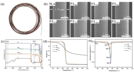 (a) Photographs, (b) scanning electron microscope (SEM) images, (c) Fourier Transform Infrared Reflection (FTIR) spectrum, (d) thermogravimetric analysis (TG) curves, and (e) differential thermogravimetric analysis (DTG) curves of different filaments (P/Lx refers to PLA/lignin, where x represents the doping amount of lignin in composites).