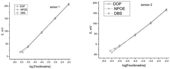 To examine the performance of the plasticizer, fexofenadine sensors based on γ-CD or calixarene with various plasticizers, DOP, DBP, and NPOE, were evaluated. The plasticizer, a fluidizer that enables uniform dissolution and the diffusion mobility of the electroactive substance, is widely acknowledged as a vital component of the PVC membrane sensor and is substantially necessary for assisting ion-exchange through the PVC-based sensors. Table 2 provides a summary of the sensor’s behaviors in relation to various plasticizers. In response to various plasticizers, sensor 1 responded with values of 54 mV/decade (DOP), 52 mV/decade (DBP), and 56 mV/decade (o-NPOE), while sensor 2 responded with values of 56 mV/decade (DOP), 53 mV/decade (DBP), and 58 mV/decade (o-NPOE). Thus, o-NPOE was the best plasticizer for use in the construction of suggested sensors. As a result, o-NPOE was used in all potentiometric tests (Figure 2).
