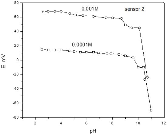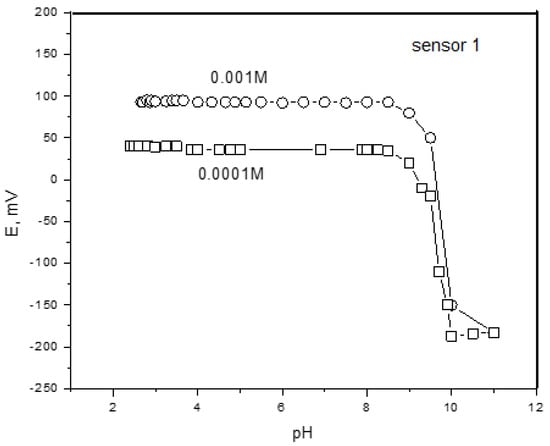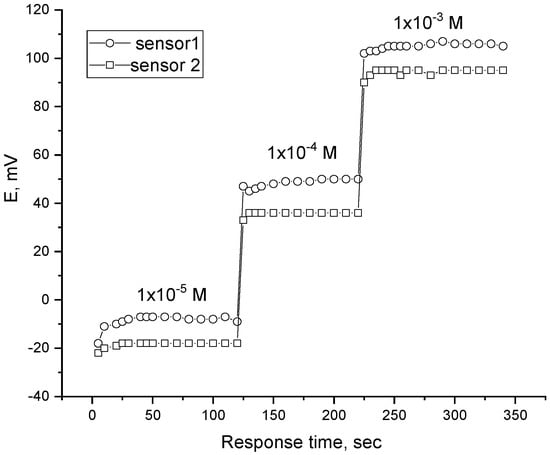 The prosed fexofenadine sensors were studied in fexofenadine solutions at different pH ranges. To ascertain the ideal pH level for the tested sensors, the membrane response at various fexofenadine concentrations was measured in a variety of pH ranges. A very diluted solution of HCl or NaOH was added to adjust the pH (0.1 mM). At various pH values, the potential was measured for two distinct concentrations of fexofenadine (1 × 10−3 and 1 × 10−4 M). Figure 4 shows that the electrode responses for sensors 1 and 2 were constant over the pH range of 2–4 [44], and the response was 56 ± 0.5 and 58 ± 0.5 mV/decade, respectively. It was found that the suitable working pH was 3.5. Therefore, the working pH was 3.5, which agreed with all reported potentiometric methods (all measurements were carried out within the pH range of 2–4) [26,27,28,29]. A decrease in the associated potential response resulted from the creation of an unprotonated species of fexofenadine at pH levels higher than 9 [44], which also caused the formation of a free fexofenadine base. The average response time [43] is the time it took from the addition of the sample to achieve a constant stable potential reading. Fexofenadine sensors had a response time of around 15 s over the concentration range of fexofenadine, after which the potential reading was constant. Figure 5 depicts the reaction timings of fexofenadine sensors. The sensor’s reproducibility throughout the day or from day to day was studied, and the potential reading was stable throughout the day or between days. The sensor had a lifetime of more than sixty days, the potential slope was generally stable (±1 mV/decade), and the electrodes produced very reliable data. For the suggested sensors, the influence of soaking times was investigated for 0.5, 1, 2, 3, 5, and 6 h, as well as overnight. It was revealed that 2 h is adequate time for the condition of the new sensor section. In the case of 2 h or more, the RSD% number was less than 3%.