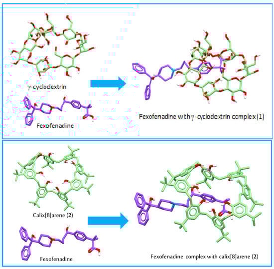 A schematic representation of γ-cyclodextrin (1), fexofenadine, and their complex and calix[8]arene (2), fexofenadine, and their complex.
