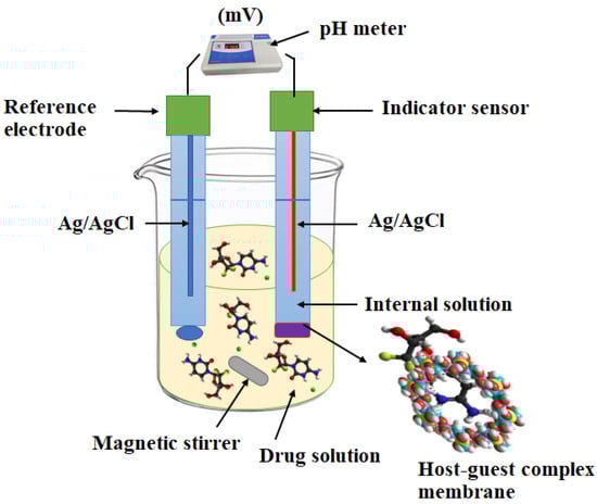 In a glass Petri dish, 190 mg of PVC powder, 3 mg of potassium tetrakis(4-chlorophenyl) borate, 10 mg of γ-cyclodextrin (sensor 1) or calixarene (sensor 2), and 0.350 mL of DBS, DOP, or NPOE were thoroughly mixed (5 cm in diameter). The component mixture was dissolved in about 4 mL of THF. The solvent was allowed to evaporate overnight while the sensing membranes were being created after the components had been thoroughly combined to construct sensors 1 and 2. A polyethylene tube (3 cm long, 8 mm id) was attached to PVC master membranes by sectioning them with a cork borer (10 mm in diameter) and using THF to glue them to it [34,35]. We used electrode bodies that we designed in our lab. These bodies were formed of a glass tube with a polyethylene tube attached to one end, and they were filled with an internal reference solution (equal volumes of a 1 × 10−2 M aqueous solution of fexofenadine and KCl). A reference electrode made of Ag/AgCl with an internal diameter of 1.0 mm was employed. The indicator electrode was preconditioned by soaking for two hours in a 1 × 10−3 M aqueous fexofenadine solution, and while not in use, it was kept in the same solution.