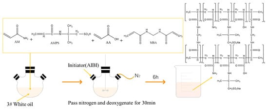Experimental drugs: Acrylamide (AM), 2-Acrylamido-2-methylpropane sulfonic acid (AMPS), acrylic acid (AA), N,N′-methylenebisacrylamide (MBA), 2,2′-azobis(2-methylpropionamidine) dihydrochloride (AIBI), sodium hydroxide, anhydrous ethanol, sorbitan monostearate (Span60), and polyoxyethylene sorbitan anhydride monostearate (Tween60), pure analysis grade, China Shanghai Aladdin Biochemical Technology Co., Ltd., Shanghai, China. 3# white oil, industrial grade, China Jingzhou Jiahua Technology Co., LTD., Jingzhou, China.