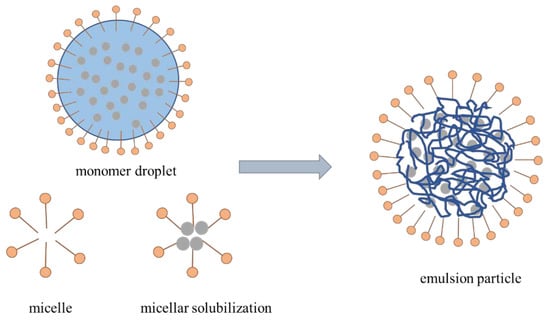 Inverse emulsion polymerization technology was first proposed by Vanderhoff in 1962. The traditional emulsion consists of an oleophilic monomer as the inner phase and water as the outer phase. The addition of an emulsifier combines the inner phase with the outer phase to form an oil-in-water (O/W) emulsion, in which, without a complete reaction, the structure of monomer droplets and micelles also forms an oil-in-water emulsion. The composition of the continuous phase and dispersed phase of the polymer microsphere is opposite to that of the traditional emulsion, but in terms of the reaction mechanism, both of them are free radical reactions generated by the initiator. The chain free radical enhances growth via the addition of the new monomer free radical and forms the polymer chain. At this time, the chain transfer is accompanied by the formation of branch chains, and the relative molecular weight decreases (as shown in Figure 7) [33]. There are four main stages in the polymerization process: (1) The dispersion stage. In the emulsifying system, the emulsifier dissolves in water and takes the form of a single molecule. After the critical micellar concentration is exceeded, the amount of emulsifier continues to increase, and the micellar form appears in the solution. (2) The latex particle formation stage. The number of monomer droplets in the system is small, and the number of monomer bead drops in the system is low, and the number of micelles is high; so, free radicals decompose and enter the micelles during the reaction. The free radicals initiate a reaction in the micelles to form polymer chains, causing the micelles to swell into emulsion colloidal particles, also known as reaction site latex particles. (3) The latex particle growth stage. In this stage, the initiator continues to release free radicals, the number of latex particles is much higher than that of monomer beads; first, free radicals are consumed in the latex particle consumption monomer reaction, the latex particle volume increases, the number of monomers reduces, and monomer beads in the monomer are also consumed or gradually disappear. (4) The polymerization completion stage. Then it is entering the polymerization completion stage, the system no longer contains micelles and monomer droplets. When the polymer concentration continues to increase and the reaction temperature is reached, the internal polymer chain and the remaining monomer no longer react, and the reaction process is terminated.