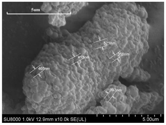 As can be seen in Figure 8, the polymer microspheres prepared via inverse emulsion polymerization in the experiment were spherical, with uniform particle sizes ranging from 300 nm to 600 nm on average. Therefore, during the drilling process, polymer microspheres, in comparison to those of traditional plugging materials, exhibit a superior capability to penetrate submicron-level pores and fractures within the formation. Additionally, they possess good gradability. When they are subjected to pressure, a dense plugging layer is formed, which improves the success rate of plugging.