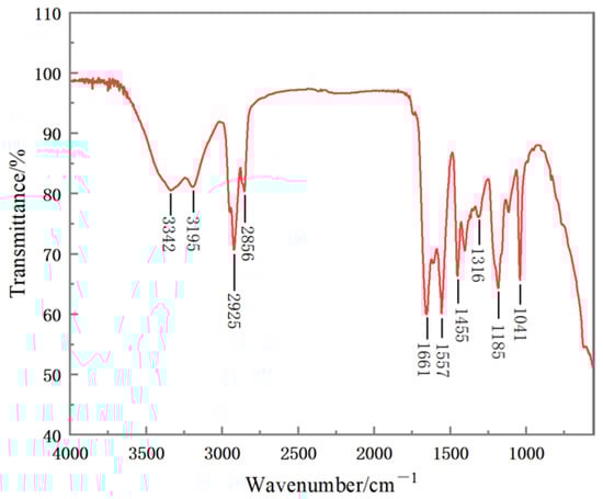 According to the infrared spectroscopic analysis of the synthesized product (as shown in the Figure 9), the -NH- medium–strong characteristic absorption peak of AM is located at 3342 cm−1. the stretching vibration absorption peak of -NH- in AMPS is at 3195 cm−1. At 2925 cm−1 and 2856 cm−1, there are methylene CH2- antisymmetric stretching vibration absorption peaks and symmetric stretching vibration absorption peaks, respectively. At 1661 cm−1 and 1557 cm−1, there are absorption peaks of -COO- and the characteristic absorption peaks of -COOH, respectively. At 1455 cm−1, there is the characteristic absorption peak of AM -CONH2. At 1185 cm−1, there is the asymmetric stretching vibration absorption peak of the sulfonic acid group in AMPS. The absorption peak of -S-O- in AMPS is at 1041 cm−1. The out-of-plane bending vibration absorption peaks of =CH and =CH2 did not appear. According to infrared spectrum analysis, it can be concluded that the polymer microspheres synthesized with AM, AMPS, and AA as the main monomers contain the corresponding functional groups designed, which proves that the expected products were obtained in the inverse emulsion polymerization experiment.