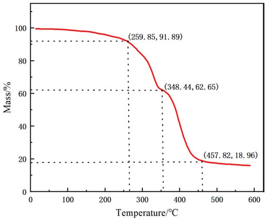 As shown in Figure 10, the weight loss process of thermal decomposition of polymer microspheres can be divided into three stages: (1) In the first stage, when the TG curve is between 0 and 259 °C, the mass of polymer microspheres is reduced by heat, mainly due to the evaporation of water absorbed by sulfonic acid groups and amide groups. (2) In the second stage between 259 °C and 348 °C, the mass of polymer microspheres decreases continuously due to the decomposition of amide groups. (3) In the third stage, between 348 °C and 457 °C, the TG curve decreases because the main chain of the polymer microsphere begins to break and the structure is damaged. Therefore, fewer polymer microspheres are lost in the first stage and have strong temperature resistance.