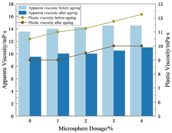 The rheological parameters of drilling fluid serve as crucial indicators for assessing the drilling fluid system and its performance. They play an important role in ensuring drilling safety, quality, and efficiency. As can be seen from Figure 11, with the increase in polymer microsphere concentration, the effective content of polymer microspheres will lead to a decrease in the oil–water ratio of the oil-based drilling fluid. In the figure, the apparent viscosity and plastic viscosity of oil-based drilling fluid both show a slight increase trend, but the variation range is small. It can be seen that the addition of different amounts of polymer microspheres has no significant effect on the rheological properties of oil-based drilling fluids before and after aging at 120 °C × 16 h.