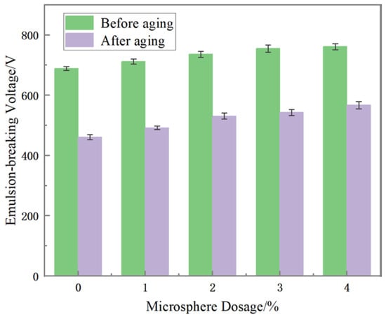 As can be seen from Figure 12, with the increase in the polymer microspheres concentration, the emulsion-breaking voltage of oil-based drilling fluid tends to rise before and after aging. It can be seen that the addition of polymer microspheres will not hurt the emulsion-breaking voltage of oil-based drilling fluid, but, it improves the emulsion stability. The polymer microspheres emulsion added to the oil-based drilling fluid is the water-in-oil emulsion itself, which exhibits excellent compatibility with oil-based drilling fluid. The submicron particles can disperse effectively at the oil–water interface, thereby enhancing the emulsion stability.