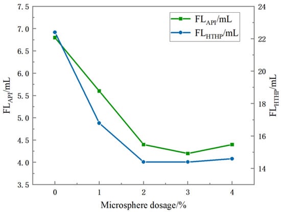 It can be seen from Figure 13 that the addition of polymer microspheres of different concentrations reduces the filtration performance of oil-based drilling fluid to a certain extent. At a normal temperature and pressure, the static filtration loss (API filtration) was reduced from 6.8 mL to 4.2 mL when 3% was added. At a high temperature and high pressure (HTHP), the minimum fluid loss was 14.4 mL with the addition of 2~3% polymer microspheres. As a result, polymer microspheres used as a plugging agent effectively reduced the API and HTHP filtration of oil-based drilling fluids and showed good thermal stability under high-temperature and high-pressure conditions.