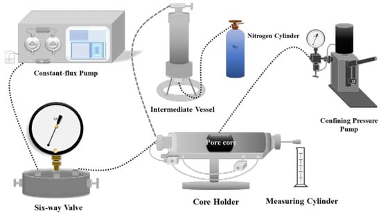 A 2.5 cm × 2.5 cm core was made according to the ratio of cement, sand, and water at 1,5,1. A liquid measuring device (as shown in Figure 14) was used to measure its permeability before and after the injection of oil-based drilling fluid, and then the sealing effect of polymer microspheres with different concentrations on pore cores was judged according to the difference between the two fields.