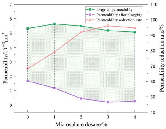 Effect of different concentrations of the polymer microspheres added to oil-based drilling fluid on the permeability and reduction rate of permeability of pore cores.