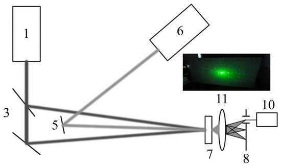 The second harmonic of the nanosecond-pulsed Nd-laser (1) at the wavelength of 532 nm was used. Two beam splitters (3) are applied. The lens (11) placed after the sample (7) revealed the grating shown in the inset to the figure with the diffraction pattern itself. An additional Nd or He-Ne laser (6) is used to visualize the diffraction order when the reversible process can be transferred in the irreversible one. The energy density was chosen in the range of 0.1–0.9 J × cm−2. The amplitude-phase thin gratings were recorded under the Raman–Nath diffraction conditions at spatial frequency (Λ) of 90, 100 and 150 mm−1. Indeed, the condition for recording thin amplitude-phase holograms under the Raman–Nath conditions was implemented, when the thickness of the medium under the test is less than the period of the formed lattice. It should be remembered that photorefractive parameters were revealed not only for the nanosensitized films, but also for pure ones for comparison.
