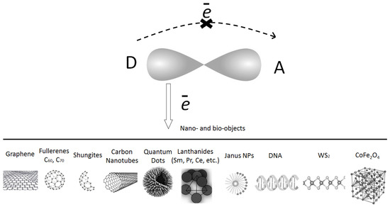 It should be mentioned that the fullerenes C60, C70 and higher ones, as well as the shungites, etc., nanoparticles are basically successfully used to sensitize the organic conjugated materials with the initial donor–acceptor interaction process. In this case, the main reasons to use, for example, the fullerenes are connected with their high value of electron affinity energy and unique energy levels. The electron affinity energy of the fullerenes is ~2.65–2.7 eV, and that of the shungite structure is ~2 eV, which is larger than those for most dyes and organic molecules intramolecular acceptor fragments. It can stimulate the efficient intermolecular charge transfer complex (CTC) formation in the nano-objects-doped organic conjugated materials. Moreover, fullerenes can accept six or more electrons [52] that permit us to dramatically increase the delocalized charge. Furthermore, shungite also has some peculiarities [53,54], such as its own dipole moment, which is close to 2D. This evidence provokes us to make a novel nanocomposite with a larger dipole moment, in comparison with the analogous value for the pure organic matrix. A qualitative picture of the predominance of the charge transfer from an intramolecular donor, not to an intramolecular acceptor, but to an injected nano-object, is shown in Figure 2. Of course, it is worth noting that nanoparticles such as WS2 and CoFe2O4 are not carbon-containing, but they are taken into account in this model for the possibility of referring to it in subsequent experiments.