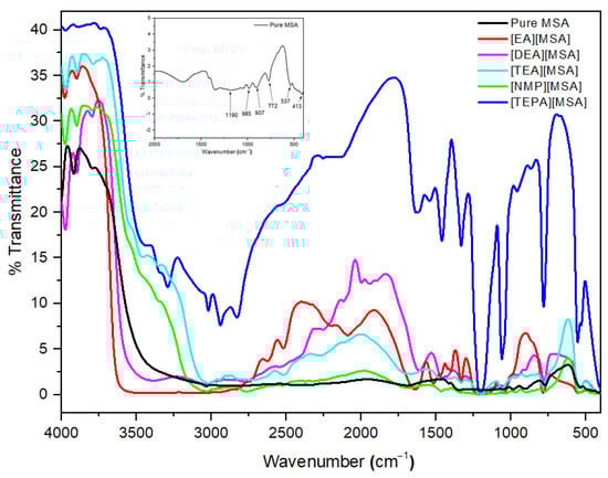 The FTIR spectrum (Figure 2) shows the presence of the specific peaks of methanesulfonic acid, which can be assigned to its different active components; the peaks at 1190 cm−1 and 985 cm−1 can be assigned to the asymmetric and symmetric stretching of SO3. The S-OH [15] and the C-S stretching peaks were obtained at 907 cm−1 and 772 cm−1, respectively [16,17]. The peaks for SO3 bending and rocking were obtained at 537 cm−1 and 413 cm−1, respectively [16]. The spectra of various PILs prepared in this study are shown in Figure 3. When the peaks of methanesulfonic acid were comparatively studied in the prepared PILs, it was observed that they showed significant shifts in the assigned values, which indicates the formation of the salts due to the combination of methanesulfonic acid and the different bases used. As most of the peaks shifted and had a slightly broadened nature (2200 cm−1–3200 cm−1), it may be suggested that these also developed hydrogen bonds among them. It may also be observed that a broadened peak around 1340 cm−1 is present in the salt samples which can be attributed to the interactions of the sulfonate ions [18]. It may also be suggested from the spectra that the samples were moisture-free as there is no significant peak for OH in the frequency range 3400 cm−1–3500 cm−1. Furthermore, from the above discussion, it is safe to conclude the successful formation of the salts of methanesulfonic acid with the different bases.