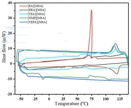 The DSC thermograms and related data of the PILs are presented in Figure 5 and Table 1, respectively. The thermal data for only two of the PILs, i.e., [EA][MSA] and [TEA][MSA] are available in the literature. [EA][MSA] had the lowest amount of water present among the PILs. It did not show a glass transition; rather, it showed a melting point around 115 °C. This value is in good agreement with the one reported earlier by Beliers and Angell [26], where a similar amount of water was present in the sample.