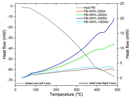 The prepared PBI membranes with varying amounts of PILs ([DEA][MSA]) were also subjected to thermal analysis (Figure 6). One can clearly observe that the neat PBI showed a glass transition temperature of around 400 °C, which showed a downward shift with the incorporation of the PILs. The incorporation of the PIL and the excess base had a plasticizing effect on the PBI polymer matrix. Similar behavior was also reported earlier for PBI membranes with other PILs [34].