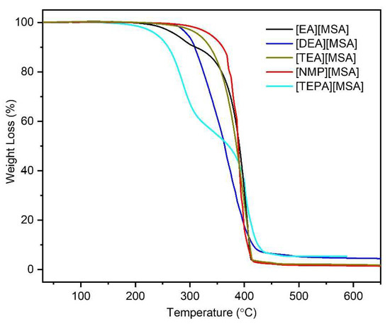 Moreover, the thermal stability of the PILs was measured using thermogravimetric analysis (Figure 7). Some of the PILs were hygroscopic; therefore, the PILs were held at 110 °C for a period of 30 min. The quantification of the water present in the samples can be performed using the weight loss while holding the sample at 110 °C. A negligible amount of water was observed in [EA][MSA], whereas [DEA][MSA], [TEA][MSA], [TEPA][MSA], and [NMP][MSA] contained 0.5 wt.%, 1.5 wt.%, 1.5 wt.%, and 0.75 wt.% water, respectively. The onset of decomposition temperatures (Tonset) of the PILs, where the first sign of weight loss was observed, was in the range of 213 °C to 315 °C. All the ILs showed complete dissociation in a single step, except for [TEPA][MS], which exhibited a two-step dissociation curve over the studied temperature range. The highest decomposition temperature was observed for [DEA][MSA] followed by [NMP][MSA], [EA][MSA], [TEA][MSA], and [TEPA][MSA], respectively. The decomposition temperature of [EA][MSA] and [TEA][MSA] agreed well with the one reported in the literature within the experimental uncertainties.