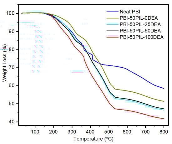 The thermal stabilities of the composite PBI membranes with varying amounts of excess amine were also studied in order to understand the optimum blending concentration (Figure 8). In comparison to the neat PBI, PBI-50PIL-0DEA showed a relatively higher onset of decomposition temperature, whereas the further increase in DEA slightly brought down the onset of decomposition temperatures. The degradation curves followed a two-step decomposition pattern, as observed elsewhere [34,35]. The first degradation started around 250 °C, which was mainly due to the onset of the degradation of the PILs, as observed in the thermal stability results for the PILS. The second degradation was observed around 400 °C, which was due to the degradation of PBI polymer backbone chains. The thermal stability of the membrane decreased slightly, but still, it is good enough for the membranes to be used for high-temperature applications.