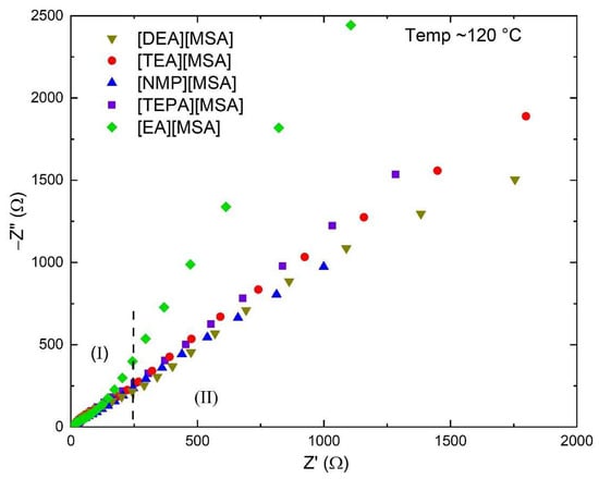 As mentioned earlier, ILs are known to have ions as charge carriers. Electrochemical impedance spectroscopy is widely used to determine the transport properties of ionic conductors. Figure 10 shows the Nyquist plots for the [MSA]-based PILs with different cations at ~120 °C. Depicted is an undeveloped semicircle in Region—I (high-frequency domain) and a straight line in Region—II (low-frequency domain) [37]. The former corresponds to the ionic diffusion phenomenon and the latter is due to the blocking-electrode effect. The curve was fitted using the Debye circuit model with a constant-phase element. The fitting yielded the bulk resistance (Rb), and thereby the electrical conductivity (σ) of the PIL. The PILs exhibited similar values of σ120°C: 1.5 × 10−3 S/cm for [TEPA][MSA]; 1.6 × 10−3 S/cm for [DEA][MSA]; and 1.7 × 10−3 S/cm for [TEA][MSA], while they exhibited a relatively higher value of σ120°C: 3.5 × 10−3 S/cm for [EA][MSA] and 6.9 × 10−3 S/cm for [NMP][MSA]. As revealed by the DSC study, the higher values of σ120°C for PILs with EA and NMP were due to the liquid state of the PILs, offering easy ion transport.