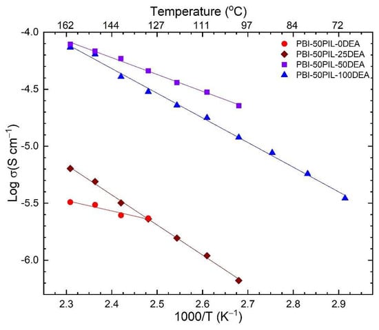 The PEMs were prepared by incorporating a [DEA][MSA] PIL 50% by weight in the PBI polymer matrix via the solution-casting method. The PILs [TEA][MSA], [NMP][MSA], [TEPA][MSA], and [EA][MSA] were incompatible with the PBI matrix. These PILs either precipitated in the polymeric solution or phase-separated during the drying process. Only the [DEA][MSA] showed good compatibility with the PBI, and a relatively better electrical conductivity was achieved for 50 wt. % content of the PIL. We also incorporated a different mole percent of the corresponding amine [DEA] in the composite electrolyte to analyze if the presence of excess amines helped in increasing the proton-conducting pathways in the membranes. The composite PEMs with 50 wt. % PIL content and 0, 25, 50, and 100 mol % excess amine were denoted as PBI-50PIL-0DEA, PBI-50PIL-25DEA, PBI-50PIL-50DEA, and PBI-50PIL-100DEA, respectively. The incorporation of excess acid (MSA) in the composite PEMs was not feasible since any amount of excess (MSA) was precipitated the PBI polymer solution. We observed σ130°C values of 2.47 × 10−6, 2.18 × 10−6, 4.3 × 10−5, and 2.8 × 10−5 S/cm for the PBI-50PIL-0DEA, PBI-50PIL-25DEA, PBI-50PIL-50DEA, and PBI-50PIL-100DEA PEMs, respectively. The temperature dependence of the proton conductivity for these membranes is shown in Figure 12. The membranes showed a linear log σ - T−1 curve for all the PEMs, revealing the Arrhenius nature of the electrolytes, with Ea values of 0.17 eV, 0.52 eV, 0.29 eV, and 0.42 eV for the PEMs with 0, 25, 50, and 100 mol % excess amine, respectively. The membrane with 50 mol. % excess amine (PBI-50PIL-50DEA) is hereafter referred to as the optimum polymer-conducting electrolyte membrane due to its high electrical conductivity along with the low activation energy, and can be utilized for high-temperature fuel cell applications. One can also note that the membrane without any excess amine (PBI-50PIL-0DEA) showed electrical conductivity only at higher temperatures (after 125 °C); however, the incorporation of the excess amine granted ionic conductivity to the PEMs at lower temperatures as well.
