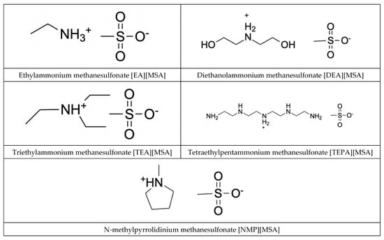 Structures of the methanesulfonic-acid-based protic ionic liquids synthesized in this work.