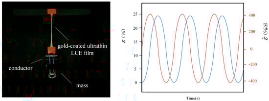 As shown in Figure 2a, a LCE fiber with original length is fixed at the fixed end, and a resistance wire is placed in the LCE fiber. Following the works of fabricating LCE made of LC monomer (RM257) and cross-linker (PETMP), etc., by the two-step cross-linking reaction reported by Yakacki et al. [76], one can first fabricate a loosely cross-linked LCE fiber in a tube with an inner curved resistance wire, and then fully cross-link the LCE fiber after being taken out of the tube and tensioned. Then, a ball with mass m is attached to the free end of the LCE fiber. The displacement coordinate system is established by taking the place where the fiber connects the ball as the coordinate origin. The initial velocity of the ball is v. During the vibration process, the instantaneous length of the LCE fiber can be denoted as , and the instantaneous displacement of the ball can be represented by , as shown in Figure 2b.