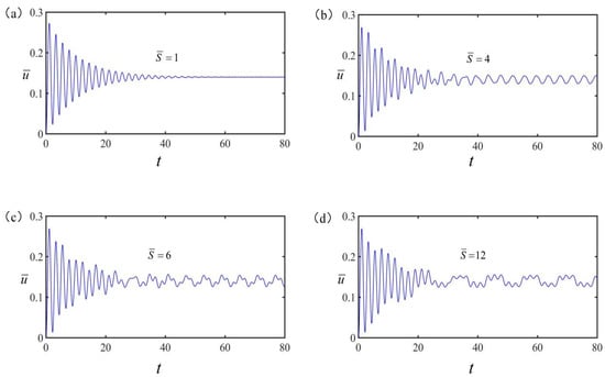 Figure 7 shows the relationship between the amplitude at the free end of the spring oscillator and time under different electrothermal drive heat energy . The system is in the optimal electrothermal drive period and the optimal electrothermal drive time rate , and the other parameters are , , , , . As observed from Figure 7b, the spring oscillator is at rest when . While , the spring oscillator is in forced vibration. It can be seen that in a periodic electrothermal drive, increasing the heat of the electrothermal drive increases the amplitude, but does not change the vibration time.
