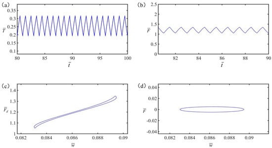 Figure 3 shows the forced vibration of the LCE spring oscillator under different dimensionless electrothermal driving periods , which is defined as , with is the electrothermal driving period. The other parameters are set as , , , , , and electrothermal drive time rate , where is dimensionless non-electrothermal driving time in a period and is defined as with is the non-electrothermal driving time in a period. As shown in Figure 3, the vibration of the spring oscillator is periodic and becomes stable after a period of non-periodic vibration. Obviously, the vibration is initially composed of free vibration and pure forced vibration. Due to the damping, the free vibration will disappear, eventually making the spring oscillator only exhibit pure forced vibration as a steady-state vibration. From the figure, the period of the steady-state vibration is consistent with the electrification period, which has a significant effect on the vibration time. As shown in Figure 3a,b, when the electrification period is within four times the natural period, the vibration presents a single-peak steady-state vibration. As shown in Figure 3c,d, when the electrification period is four times longer than the natural period, the vibration presents a multi-peak steady-state vibration. For the sake of later discussion, we will only discuss the single-peak steady-state vibration. The multi-peak steady-state vibration is relatively complex and will not be discussed in this paper. For the single-peak steady-state vibration, the amplitude and equilibrium position are defined as and for convenience. The and in the expression refer to the maximum and minimum values of the vibration displacement at the tip of the steady-state vibrating spring oscillator.