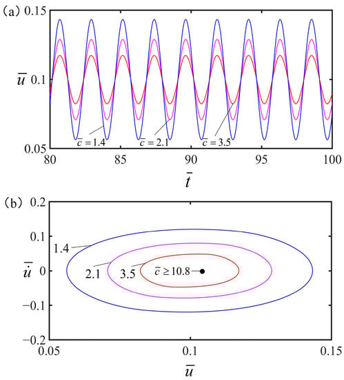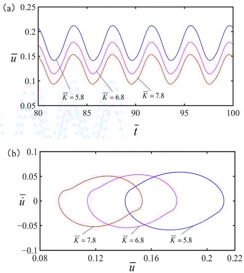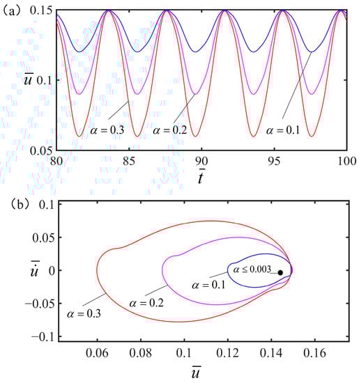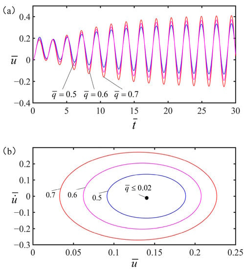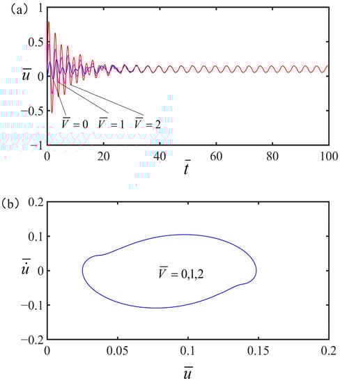 Figure 12 presents the influence of the initial velocity on the vibration of the spring oscillator at the optimal electrothermal drive time rate. In the case, the parameters are , , , , , and . It is clear in Figure 12a that the vibration amplitude of the spring oscillator increases with the increase of initial velocity. Figure 12b indicates that when the initial velocity exists, the spring oscillator will be in a state of forced vibration, and the limit cycle remains unchanged. It can be seen that under the periodic electrothermal drive, the initial velocity only affects the initial amplitude, and then the vibration is stable.