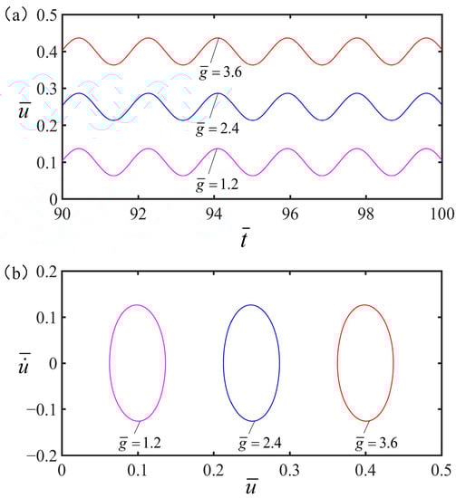 Figure 9 plots how the gravital accelerational influencing the vibration of the spring oscillator under the optimal electrothermal drive time rate. The parameters are set as , , , , , and . Figure 9a shows that the equilibrium position of the forced vibration rises as the gravital acceleration increases. As can be seen from Figure 9b, when gravity acceleration exists, the whole spring vibration subsystem will be in a state of forced vibration, gravity acceleration has an important effect on periodic electrothermal drive vibration.