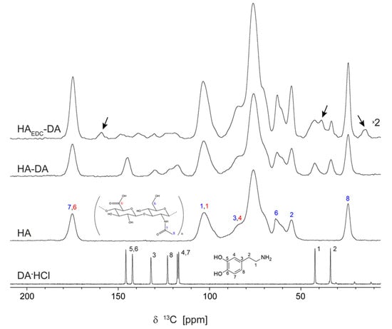 The 13C ss-NMR spectra of DA∙HCl, HA, HA-DA, and HAEDC-DA recorded by the CP-MAS sequence, as described in Section 2. The assignment follows the labeling scheme in the drawn chemical structures, which is detailed in the text. Those ss-NMR lines certainly not produced by DA are marked with arrows in the HAEDC-DA spectrum.