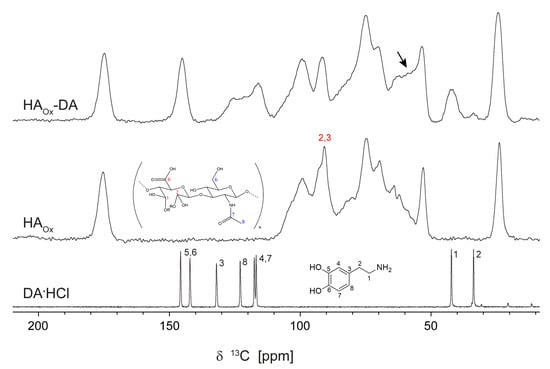 The 13C ss-NMR spectra of DA∙HCl, HAOx, and HAOx-DA recorded by the CP-MAS sequence as described in Section 2. The assignment follows the labeling scheme in the drawn chemical structures, which is detailed in the text; compared to pristine HA in Figure 2, only the new peaks corresponding to hemiacetal formation are explicitly shown here. The possible line-shift of an important part of the DA C2 carbons is marked with an arrow in the HAOx-DA spectrum.