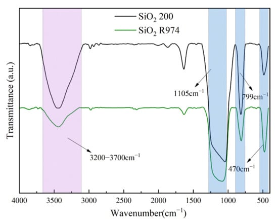The absorption bands at 1105 cm−1 and 470 cm−1 are the asymmetric stretching vibrational band and bending vibrational band of Si–O in SiO2, respectively, while the symmetric stretching vibrational band of Si–O is at 799 cm−1, as shown in Figure 3. The strong and wide –OH band of SiO2 200 in the wave number band of 3200–3700 cm−1 is due to the easy water absorption of SiO2. This is also due to the presence of a certain amount of loosely bound and tightly bound water on the surface of SiO2 200 without surface hydrophobic treatment, while the intensity and width of the band of SiO2 R974 treated with a DDS surface hydrophobic treatment is significantly lower than that of SiO2 200, indicating a significant reduction in the hydroxyl content of the hydrophilic groups on the surface and a significant reduction in surface-bound water.