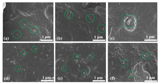 Figure 4 displays the SEM images of the PP and SiO2/PP composites. When the samples undergo brittle fracture treatment, they experience stress, resulting in the appearance of wavy, striped areas in the images. In addition, the nanostructures are marked in the figure, where the positions with large agglomeration are circled by square boxes, and the relatively uniform positions are circled by column boxes. From the SEM images, it can be observed that in composites 0.5 US, 1.0 US, 0.5 TS, and 1.0 TS, the nanostructures are evenly dispersed within the PP matrix, and the agglomeration phenomenon is relatively minor. This is primarily due to the lower nano content in these composites.