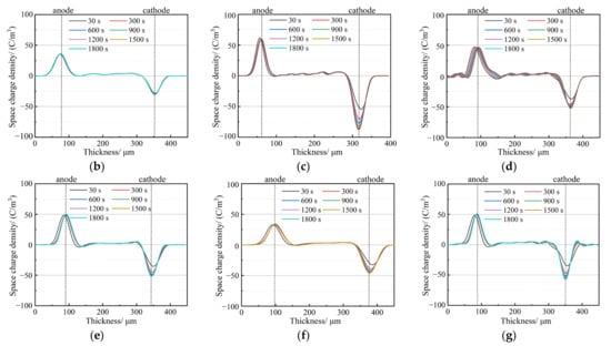 In Figure 6, the space charge distribution at various time intervals (30 s, 300 s, 600 s, 900 s, 1200 s, 1500 s, and 1800 s) after a short-circuit discharge is depicted. From the figure, it is evident that there is a significant presence of space charges at the cathode and anode of the PP sample after a short circuit, with the largest amount of residual charge. However, the addition of nanostructured SiO2 noticeably reduces the residual charge in the sample. When the nanostructured SiO2 content is 0.5 wt% and 1.0 wt%, the charge distribution of the two types of nanostructured SiO2 is similar, with a small amount of residual charge observed. On the other hand, when the nanostructured SiO2 content is 3.0 wt%, the residual charge is the highest, and there is a certain amount of positive and negative polarity charge at the cathode and anode. As the discharge time increases, the residual charge of all nanocomposites gradually decays to zero. However, even after the 1800 s of discharge, PP still retains a certain amount of residual charge.