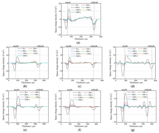 Space charge distributions of PP and SiO2/PP composites in short connection: (a) PP, (b) 0.5 US, (c) 1.0 US, (d) 3.0 US, (e) 0.5 TS, (f) 1.0 TS, (g) 3.0 TS.